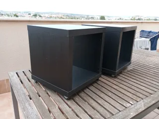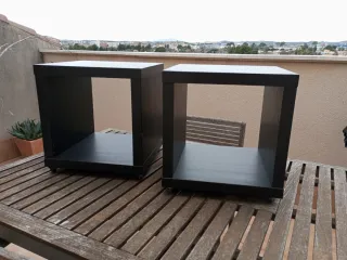 Conjunto de dos estanterías de diseño moderno. - Estructura de plástico. - Acabado en color negro. - Forma cúbica y rectangular. Talla o dimensiones: Estantería pequeña: 40alto* 30 fondo* 40 ancho Estantería grande: 40 alto* ancho 80* fondo 30.