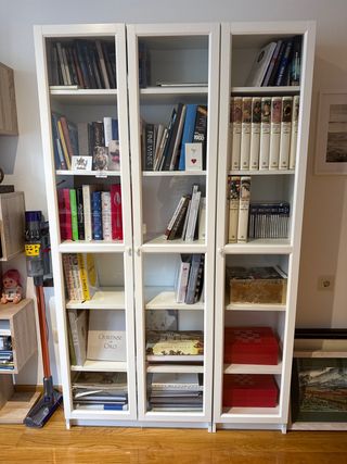 Vitrina negra de Ikea, modelo HEMNES, DESCATALOGADA. - Puertas correderas de cristal. - Estructura de madera oscura. - Estantes interiores ajustables. Medidas: Ancho 120 cm Alto 130 cm Fondo 37 cm Tiene alguna marca de uso y tiene un refuerzo en un larguero trasero que no se ve (ver última foto). Pero buen estado en general. Se entrega montada en Maceda. Posibilidad de acercar hasta Ourense (El precio sería 140€)
