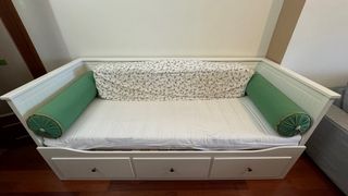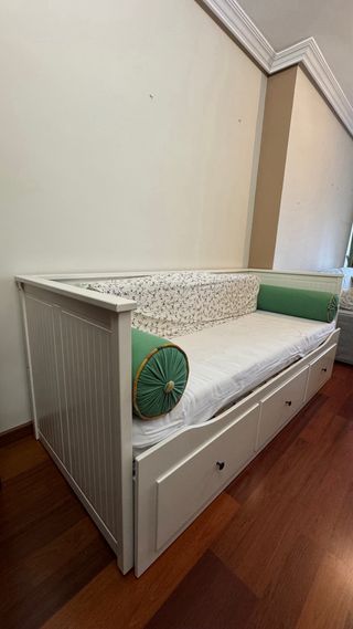Vendo diván de **IKEA modelo HEMNES Daybed Frame with 3 Drawers en color blanco. Muy práctico: se puede usar como sofá, cama individual o cama doble. Se abre fácilmente hasta 160x200 cm y tiene 3 cajones grandes para guardar ropa de cama, mantas o ropa. Ideal para habitaciones pequeñas, habitación de invitados o pisos con poco espacio. Venir a recoger y pago en efectivo.