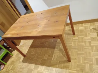 Mesa de comedor de madera maciza, ideal para cualquier hogar. Su diseño sencillo y robusto la hace muy práctica. - Tablero de madera con vetas visibles. - Patas de madera firmes y estables.