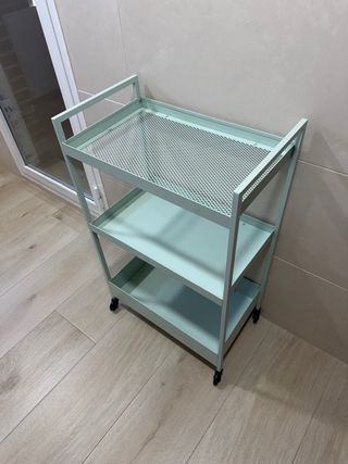 POR MUDANZA, más artículos en mi perfil. Carrito auxiliar de la marca Ikea, ideal para organizar cualquier espacio. - Estructura metálica. - Color verde menta. - Tres niveles de almacenamiento. - Ruedas para fácil movilidad.