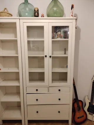 Mueble vitrina de la serie Hemnes de Ikea. Cuenta con puertas de cristal y cajones. - Diseño de dos puertas acristaladas. - Dos cajones inferiores. - Estructura de madera. Los cajones no están en buen estado pero se pueden arreglar y quedarían perfectos (sería cambiar la madera del fondo y atornillar bien a un lado). Salvo los cajones, está en muy buen estado. Imprescindible pasar a recoger