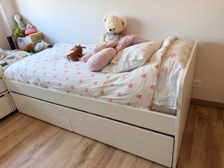 Cama nido modelo SLÄKT de IKEA, color blanco, ideal para habitación infantil o juvenil. Incluye cama principal + cama inferior extraíble, que permite usar dos camas individuales a la vez. Muy práctica para hermanos o para cuando vienen invitados. Diseño robusto, estable y fácil de manejar. Estado: bueno, bien cuidada, sin golpes aunque algún pequeño arañazo. ⸻ 📐 Medidas • Cama principal: 90 × 200 cm • Cama inferior: 90 × 200 cm (Colchones y ropa de cama no incluidos)