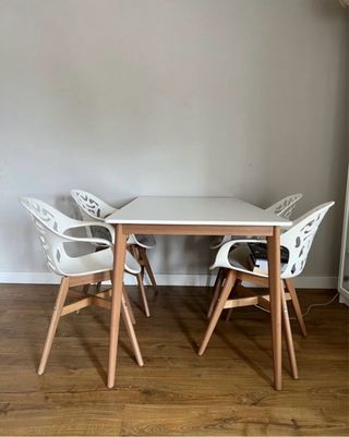 Conjunto de mesa con cuatro sillas de estilo escandinavo IKEA. La mesa tiene alguna marca de uso normal, mirar fotos. Las sillas están en perfecto estado. Modelo retirado de catalogo. Tambien puedo venderlo por separado.