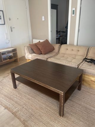 Mesa de centro con un acabado en madera natural. Con una mano de pintura quedara exepcional. Tiene un toque sofisticado, es grande y espaciosa. Se ve mejor en directo que en foto, me la quedaria pero mi living es extremadamente pequeño.