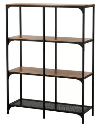 Estantería de diseño industrial de Ikea, modelo FJÄLLBO. Combina a la perfección la calidez de la madera con la robustez del metal. - Estructura de metal negro. - Tablero superior de madera.