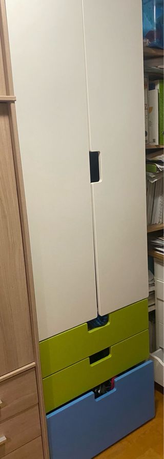 Armario infantil de Ikea con un diseño moderno y divertido. Mucha capacidad. se incluyen los separadores de los cajones a medida. - Puertas blancas. - Cajones de colores: dos verdes y uno azul. - Tiradores integrados en los cajones.