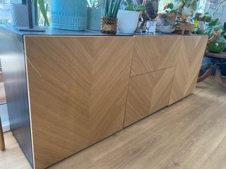 Mueble de almacenamiento con un diseño moderno y elegante. Sus líneas en espiga le dan un toque distintivo. - Patas bajas que aportan estabilidad. - Superficie superior lisa y amplia.