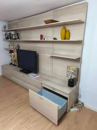 Gran oportunidad! Mueble de salón/salita modular con un diseño moderno y funcional. Como nuevo!!! - Acabado en madera clara. - Combina estanterías y cajones. - Ideal para organizar tu espacio. - Solo el mueble (no entran TV u otros elementos de la foto) - Medidas aproximadas y hay que llevar herramientas para desmontaje y ayuda para trasladar.