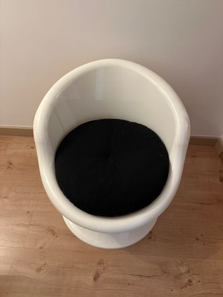 Butaca moderna Popptorp de Ikea. Su diseño combina líneas curvas con una base sólida. - Estructura de plástico blanco. - Cojín redondo negro.