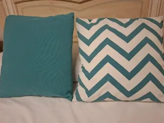 Set de dos cojines decorativos con un diseño moderno. - Un cojín liso en color teal. - Un cojín con estampado de zig-zag en teal y blanco. - Fundas de tela.