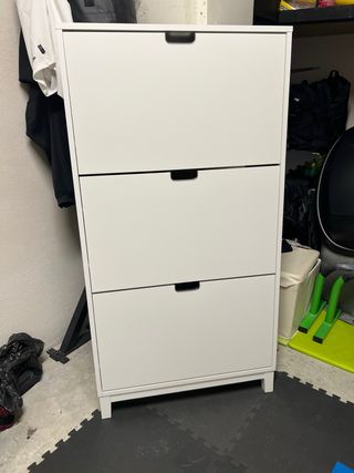 Bonito zapatero de Ikea, en color blanco y de madera. Está en buen estado. - Tiene tres cajones espaciosos. - Diseño sencillo y elegante. - Ideal para organizar el calzado. lo unico tiene una grieta de la pintura en el costado como se ve en la foto pero esta perfecto.