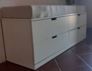 Cómoda zapatera de Ikea, en color blanco y fabricada en madera. Tiene cuatro cajones espaciosos. Es perfecta para organizar el calzado y ofrece un asiento cómodo. Regalo una espuma con funda para poner en la parte superior. Costó 249 € y lo vendo por 98€. Precio no negociable.
