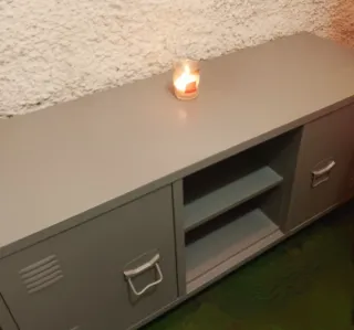 Mueble de TV de diseño industrial con acabado en metal. - Tres puertas con tiradores. - Patas cónicas metálicas, una de ellas un poco suelta como se ve en las fotos, pero el mueble es muy estable -Algunas marcas de desgaste y uso