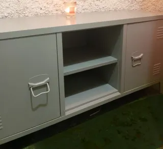 Mueble de TV con un diseño moderno tirando a industrial. IKEA. - Estructura metálica negra. - Tablero de madera con acabado rústico. - Puertas con rejilla metálica negra también. - Estantes interiores. - 150x36x54 cm Dejo un foto con las medidas para más detalle. El precio original lo dejo en foto para que se vea, fueron 119€. Sería para recoger ya montado en Sant Antoni y está en perfecto estado. Ni una rayada, ni mancha ni nada.
