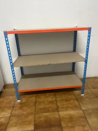 Estantería de estilo industrial con estructura metálica y baldas de madera. - Diseño robusto y funcional. - Combinación de colores llamativa. -Medidas de 1m ancho 1m de alto x 50cm
