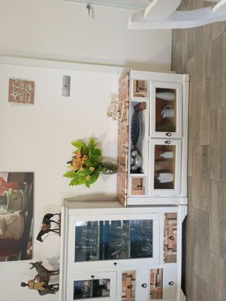 Dos muebles madera ,pintados en blanco y adornos de vinilo,tiradores antiguos de hierro.La vitrina 102 de frente,126 alto,39 anchura. Muebles bajo 135 frente,66 altura y 36 ancho.