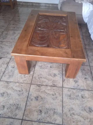 Elegante mesa de centro fabricada en madera maciza. Su diseño destaca por un intrincado tallado a mano en la superficie. Falta colocar cristal.