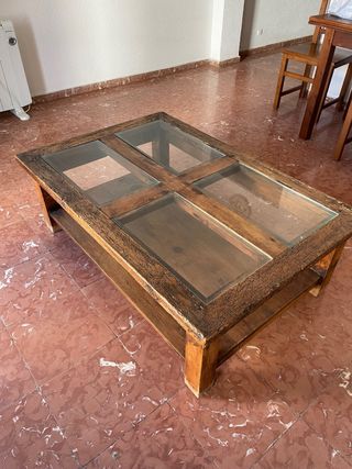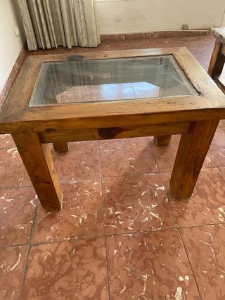 Elegante mesa de centro con un diseño rústico y robusto. - Fabricada en madera maciza. - Encimera de cristal con divisiones. - Patas gruesas y estables. Ver mi perfil para el conjunto completo.