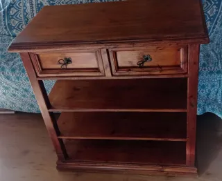 Mueble de estilo mexicano con un acabado en madera oscura. Cuenta con dos cajones en la parte superior y tres estantes abiertos debajo, ofreciendo amplio espacio de almacenamiento. - Diseño de dos cajones con tiradores ornamentales. - Tres niveles de estanterías abiertas. - Construcción robusta en madera.