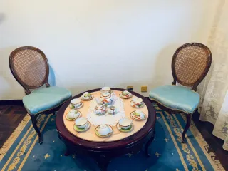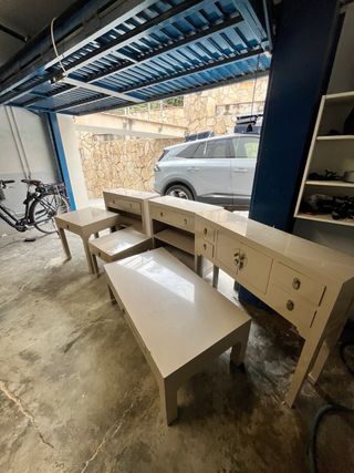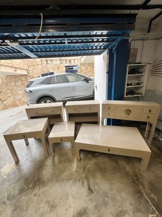 Conjunto de muebles estilo oriental / chino en madera maciza lacada en blanco con tiradores dorados. Diseño elegante tipo Golden Dragon Oriental. Muebles de buena calidad y muy resistentes. El conjunto incluye:• 1 consola con cajones• 1 mesa de centro• 2 mesitas de noche• 2 mesas auxiliares En buen estado general. Ideal para salón, dormitorio o entrada de casa. Precio negociable si se llevan todo el conjunto.