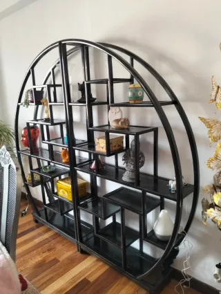 Elegante estantería de estilo oriental con un diseño circular. - Estructura principal en negro. - Detalles decorativos multicolor. - Fabricada en metal y madera.
