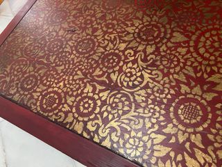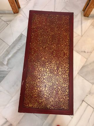 Pieza única, anticuario/colección. Mesa baja lacada en rojo y oro, origen asiático (estilo tailandés/birmano). Decoración floral dorada pintada a mano, friso calado y patas cabriolé. Una pieza con personalidad, difícil de encontrar en el mercado de antigüedades por su singularidad y estilo. 📐 138 × 65 × 36 cm Presenta desperfectos propios de su antigüedad (astillados en esquinas, craquelado en superficie), acordes con el carácter de la pieza. Opcional: cristal a medida 0,8 espesor, que protege la superficie sin ocultar la decoración. ((+100€))