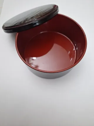Elegante caja de estilo oriental laqueado. - Diseño circular. - Combinación de colores negro y marrón. - Fabricada en madera - 14 cm diámetro