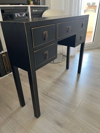 Elegante mesa recibidor con un diseño inspirado en el estilo oriental. Ideal para dar un toque distintivo a tu entrada o salón. - Acabado en negro y plateado. - Patas de madera. - Cajones y puertas con tiradores metálicos. Se vende únicamente la mesa