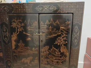 Precioso mueble de estilo chino con un diseño lacado y detallado. - Acabado lacado en negro con detalles dorados. - Elaborado en madera de calidad. - Diseño oriental con motivos paisajísticos y figuras. Medidas: 120 cm largo, 42cm fondo y 85cm de alto. Ideal para recibidores o salón. En su interior tiene 2 bladas para almacenaje.