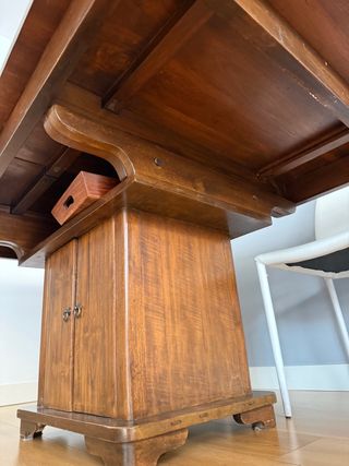 Elegante mesa de madera maciza con un diseño inspirado en el estilo Art Decó oriental. Su robusta construcción y acabados detallados la convierten en una pieza única. Medidas de mesa cerrada: largo: 1,58cm; ancho: 99 cm; alto: 76 cm. Medidas con extensión (50cm): largo 2,08. Medidas cajón base: ancho: 44cm ; alto 46 cm. - Fabricada en madera maciza. - Estilo oriental Art Decó. - Color marrón oscuro. - Forma rectangular
