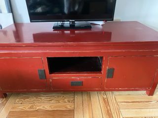 Mueble de televisión con un diseño llamativo y elegante. - Acabado en laca roja brillante. - Estructura de madera robusta. - Tiradores metálicos. - Compartimento central abierto. - Puertas laterales con almacenamiento.