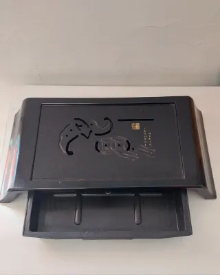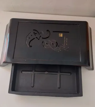 Elegante mesita de estilo oriental con un diseño intrincado y un cajón inferior. 42 x 22 x 5'5 cm - cajón inferior. - Acabado principal en negro profundo con detalles decorativos en tono dorado. - Elaborada con una combinación de madera y plástico.
