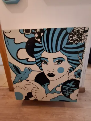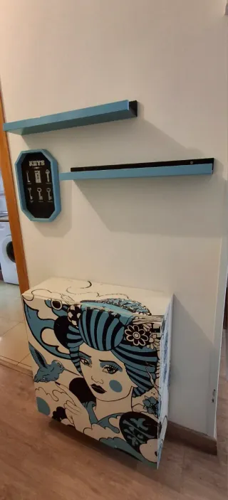 Mueble de entrada con un diseño artístico y llamativo. - Estilo moderno con motivos orientales. - Combinación de colores negro y azul. - Ideal para dar un toque único a tu recibidor. Ancho 60 x Alto 64 x Fondo 23 Baldas: Ancho 55 + Fondo 10 ●Fecha limite de venta 10.04
