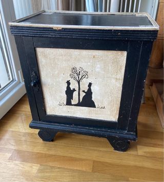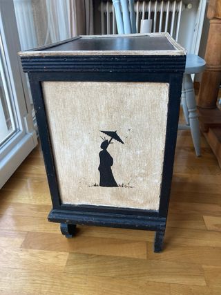 Mesilla auxiliar con un diseño único y llamativo. Presenta una escena oriental en su frontal. - Acabado en negro y beige. - Fabricada en madera. Tiene algunos desperfectos Precio negociable