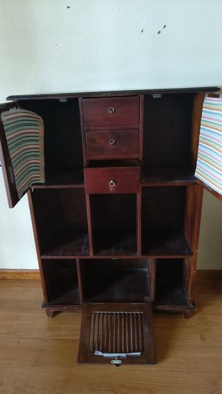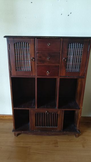 Mueble de madera maciza con un diseño elegante y funcional. - Acabado en tono marrón oscuro. - Múltiples compartimentos y cajones para almacenamiento. - Puertas con detalles de celosía. Estilo: Similar a gabinetes de almacenamiento orientales o coloniales, ideal para pasillos o recibidores. En una foto se ve que le falta una pata trasera, que esta sustituido por unas piezas de otra madera. - Se recoge en zona Escorial Los Arroyos.