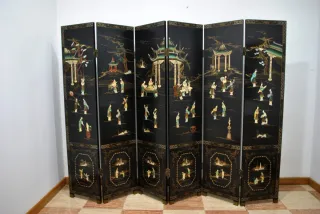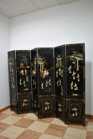 REF: Espectacular biombo oriental de seis hojas, realizado en madera lacada en negro y decorado con exquisitas escenas tradicionales asiáticas de marfil en relieve, con incrustaciones tipo nácar y detalles dorados pintados a mano. Cada panel representa delicadas escenas de la vida cotidiana en jardines orientales, con figuras, pagodas y paisajes finamente trabajados, aportando profundidad y un gran valor artístico. Medidas: 245 cm ancho x 183 cm alto.