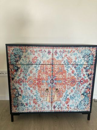 Elegante aparador con un diseño llamativo y original. - Patas de metal negro. - Puertas con estampado oriental. - Tiradores dorados con borlas. - Precio de mercado 430€