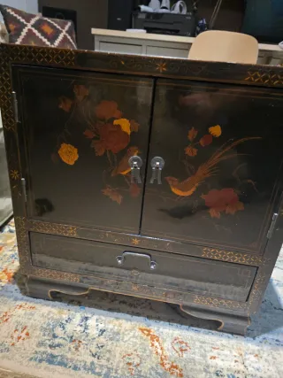 Precioso baúl de madera lacada en negro y dorado. Adornado con una escena oriental de grullas y paisajes. - Diseño elegante y detallado. - Ideal para decoración o almacenamiento. - Piezas de nácar incrustadas.