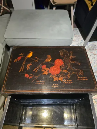 Elegante mesa de salón de madera (no maciza), con un diseño inspirado en el estilo chino. Es de los años 70. En buen estado. Mejor ver. - Encimera de cristal superior, que se puede quitar y poner otra a tu gusto. - Base de madera oscura. - Detalle de pintura oriental con pájaro y ramas que se puede cambiar o tapar. - Medidas: 115 cm largo x 55 cm ancho x 52 cm alto. A recoger en Parque Venecia.