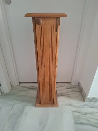 Mueble de madera versátil que puede usarse como mueble para CDs o como pedestal para plantas. - Diseño con detalles tallados. - Acabado natural de la madera. - Base cuadrada para mayor estabilidad.