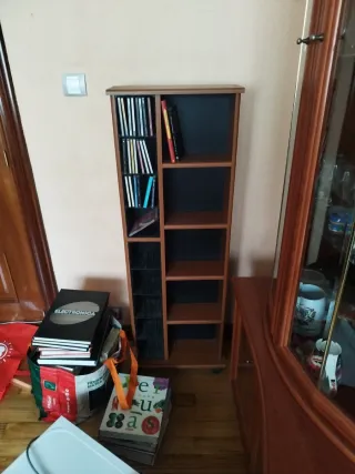 Mueble de madera con varios estantes, ideal para organizar CDs, DVDs o libros. - Diseño vertical y estrecho. - Acabado en tono madera natural. - Estructura robusta. En perfecto estado