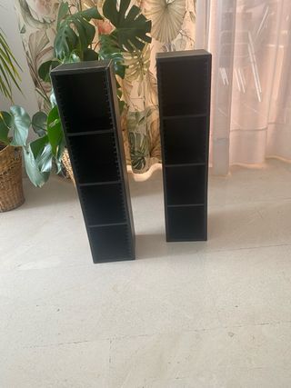 Conjunto de torres para almacenar CDs, DVDs o Blu-rays. Se encuentran en perfecto estado. - Estructura de madera. - Capacidad para múltiples discos. 15 € cada una, si se compran las dos 25€ Las baldas se pueden poner a distintas alturas según se guarden CD o películas