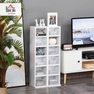 Mueble porta CD en madera aglomerada de calidad, dimensiones 89L x 20P x 130.5A cm, con 24 estantes rectangulares para organizar hasta 456 CD o 336 DVD/Blu-ray. Los estantes son ajustables en 3 niveles, excepto el estante intermedio, para adaptarse a objetos de diferentes tamaños. Capacidad máxima de carga de 50 kg, con una carga máxima por estante de 3 kg. Diseño elegante, fácil de limpiar y resistente a las manchas. Requiere ensamblaje. Ideal para sala de estar, dormitorio u oficina. Incluye 1 mueble porta CD y manual de instrucciones.