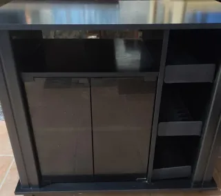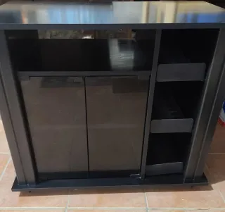 Mueble de diseño moderno con espacio de almacenamiento. - Armario con puertas frontales. - Estanterías laterales para CDs o decoración. - Acabado en color negro. Se puede recoger en mano en Barbastro