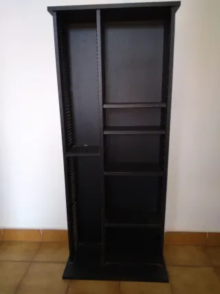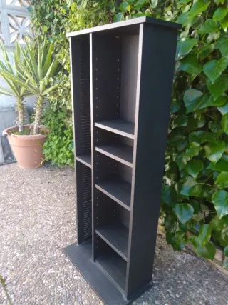 Mueble organizador para CDs y DVDs con varios estantes. -6 estantes para poner CD o DVD, 4 estrechos y 2 más ancho( se ve en foto) - Diseño vertical. - Acabado en madera. - Compartimentos en color negro.