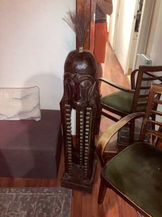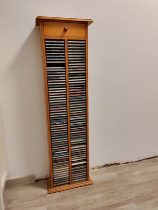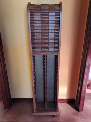 Bonita estantería para CDs de madera. Está en buen estado y tiene capacidad para muchos discos. - Perfecta para organizar tu colección de música. - Diseño elegante y curvado. - Aproximadamente 75 espacios para CDs. - 1'50 m alto