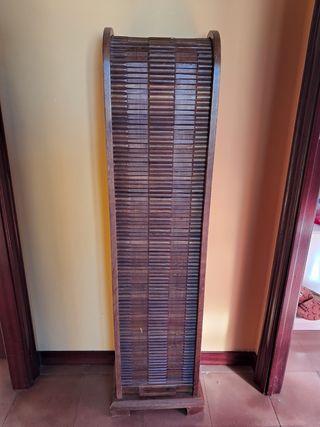 Bonito mueble de persiana antiguo. Es de teca y sirve para guardar cd. Con algún rasguño exterior y algún desperfecto interior
