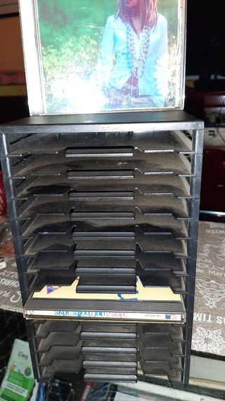 Soporte para 25 CDs, para organizar tu colección. En buen estado. Ideal para tener sobre el escritorio o dentro del armario. -En plástico duro, con base antidesplizante de 18,5 x 16 cms. - con baldas movibles, que facilitan ver y sacar cada CD.
