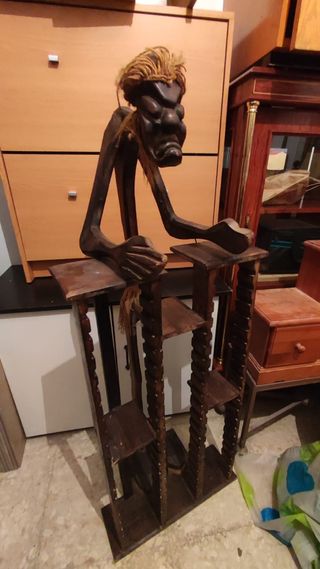 Figura Africana de madera tallada para almacenar los CD. También se puede usar como decoración, ya que es una antigüedad. Más información preguntar.